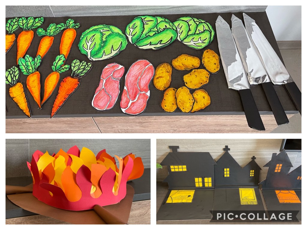 比完舞接着还有校内小小说书人比赛。听说有道具有加分,个人承揽了手工制作,前前后后花了10个小时,做了一些蔬菜、火把、匕首、示意卡… 。希望你能有精湛的演出。